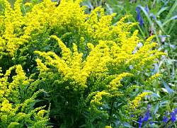 Очень удачная, если так можно выразиться, форма золотарника. Образует пышный широкий куст высотой всего 30-35 см. Листья тонкие, многочисленные, ярко-зеленые. Соцветия — метелки длиной около 15 см — яркого лимонно-желтого цвета. Цветение очень позднее, в сентябре.