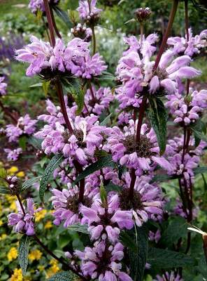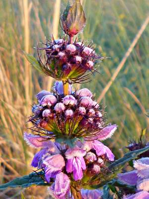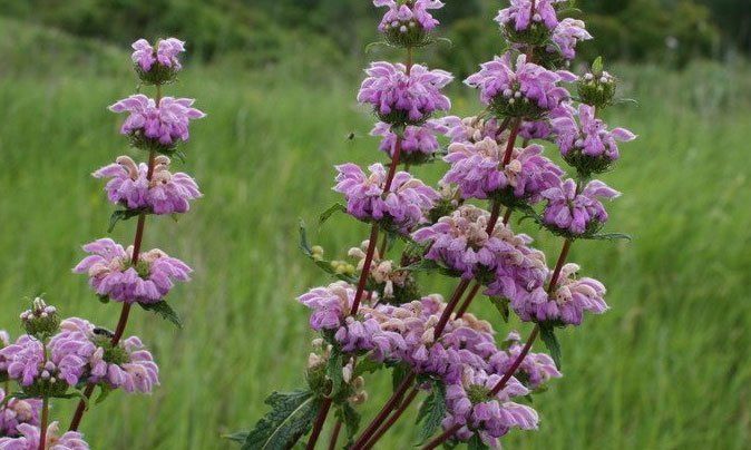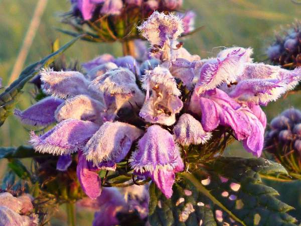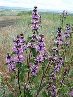 Зопник клубненосный. Имеет темно-зеленые треугольные листья, опушенные серым пухом. Высота стебля от 30 см до 100 см. Цветет шикарными розовыми гроздями. Цветение проходит в июне-июле в зависимости от климатической зоны.